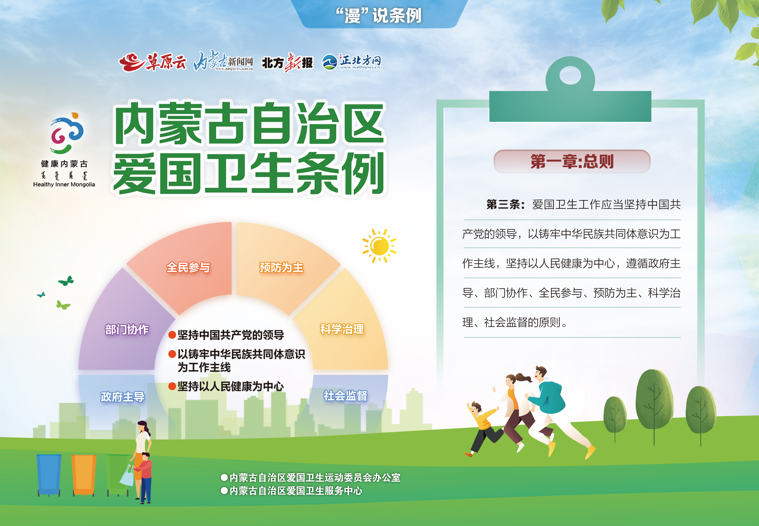 第三条 爱国卫生工作应当坚持中国共产党的领导,以铸牢中华民族共同体意识为工作主线,坚持以人民健康为中心,遵循政府主导、部门协作、全民参与、预防为主、科学治理、社会监督的原则。
