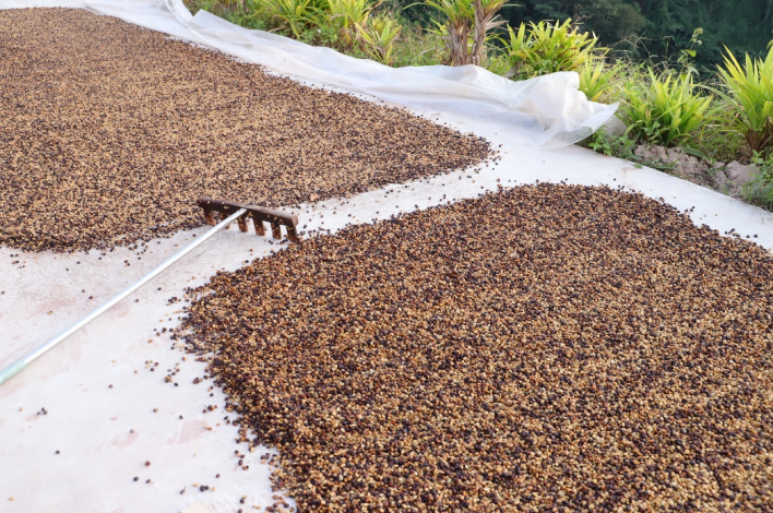 在云南普洱的咖啡庄园,咖啡正在进行日晒处理