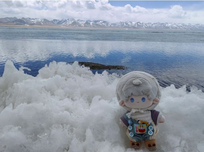 西藏姑娘白玛曲珍带着从拼多多购买的玩偶打卡纳木措