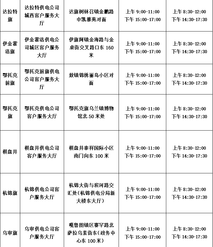 假期期间,鄂尔多斯供电公司将对各级客户服务大厅营业时间进行调整,除下述客户服务大厅以外其他客户服务大厅暂停营业,2026年1月4日开始,各级客户服务大厅恢复正常营业时间,具体营业情况如下: