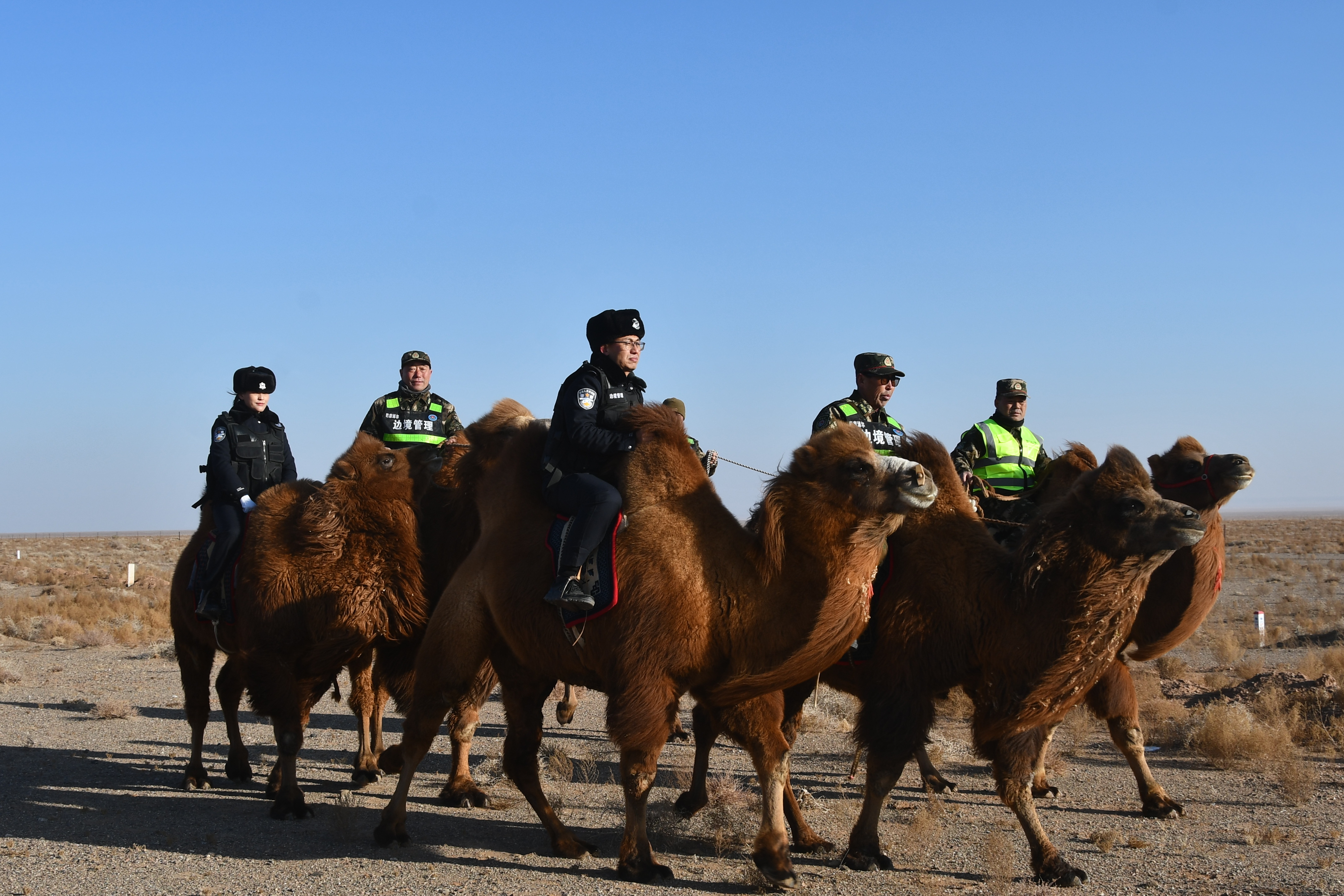 此次巡边活动结合边境辖区地形特点,采取 “徒步巡边+骑骆驼巡边” 相结合的方式,注重对边境线重点路段、复杂区域进行全方位巡查,仔细排查边境护栏、界碑等设施是否完好,并对损坏和倾斜的二线铁丝网进行维护维修,确保不留安全死角。途中民警与护边员们驾驭着经验丰富的骆驼,骆驼稳健的步伐踏过沙丘,清脆的驼铃声在空旷的边境线上回荡,形成一道独特的巡边风景线。护边员宝乐格表示:“和民警们一起巡边这么多年,早已把守护边境当成自己的使命,能在110警察节期间于民警并肩守护祖国边疆,特别有意义。”