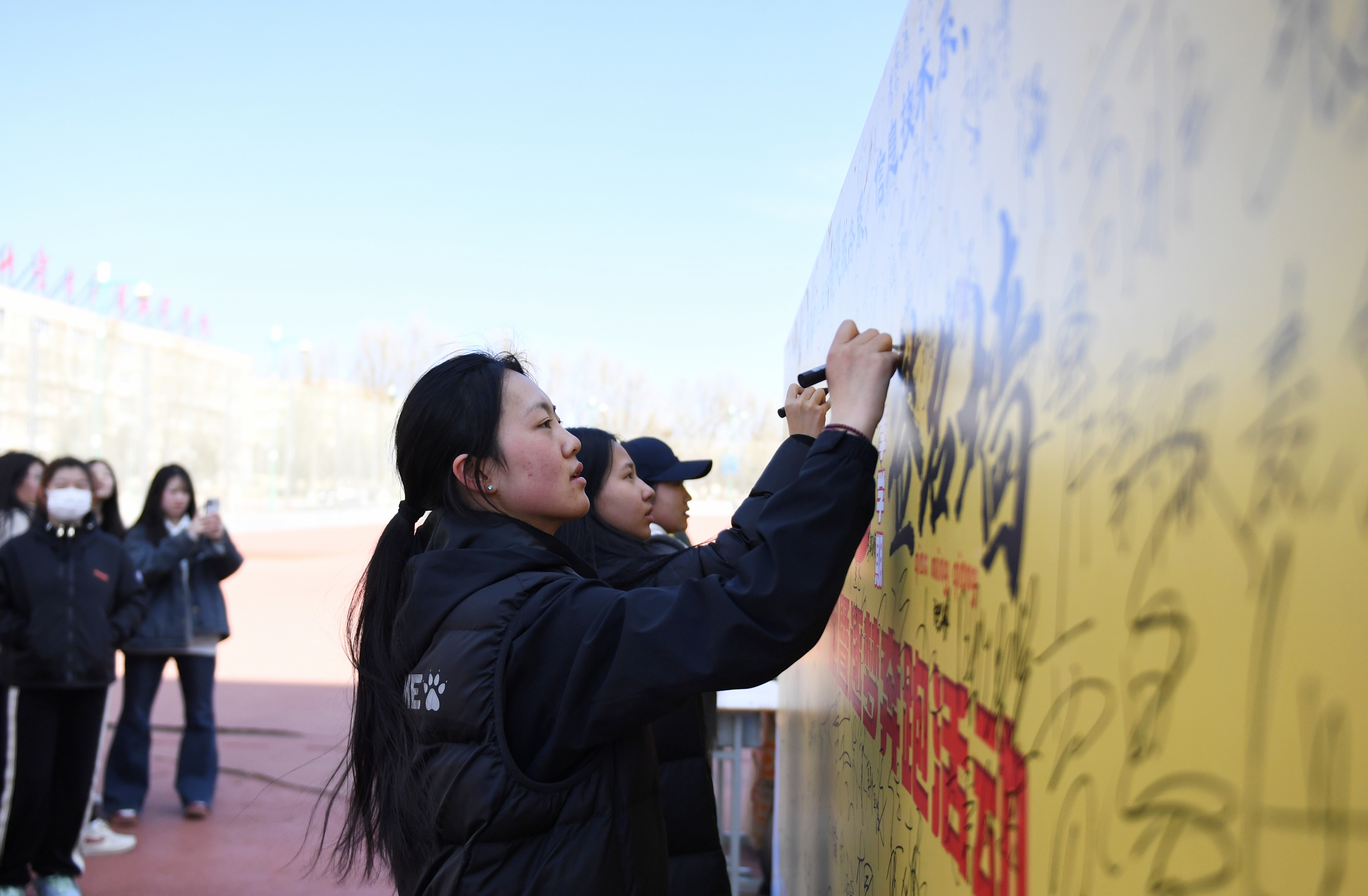 同学们在签名墙上签名