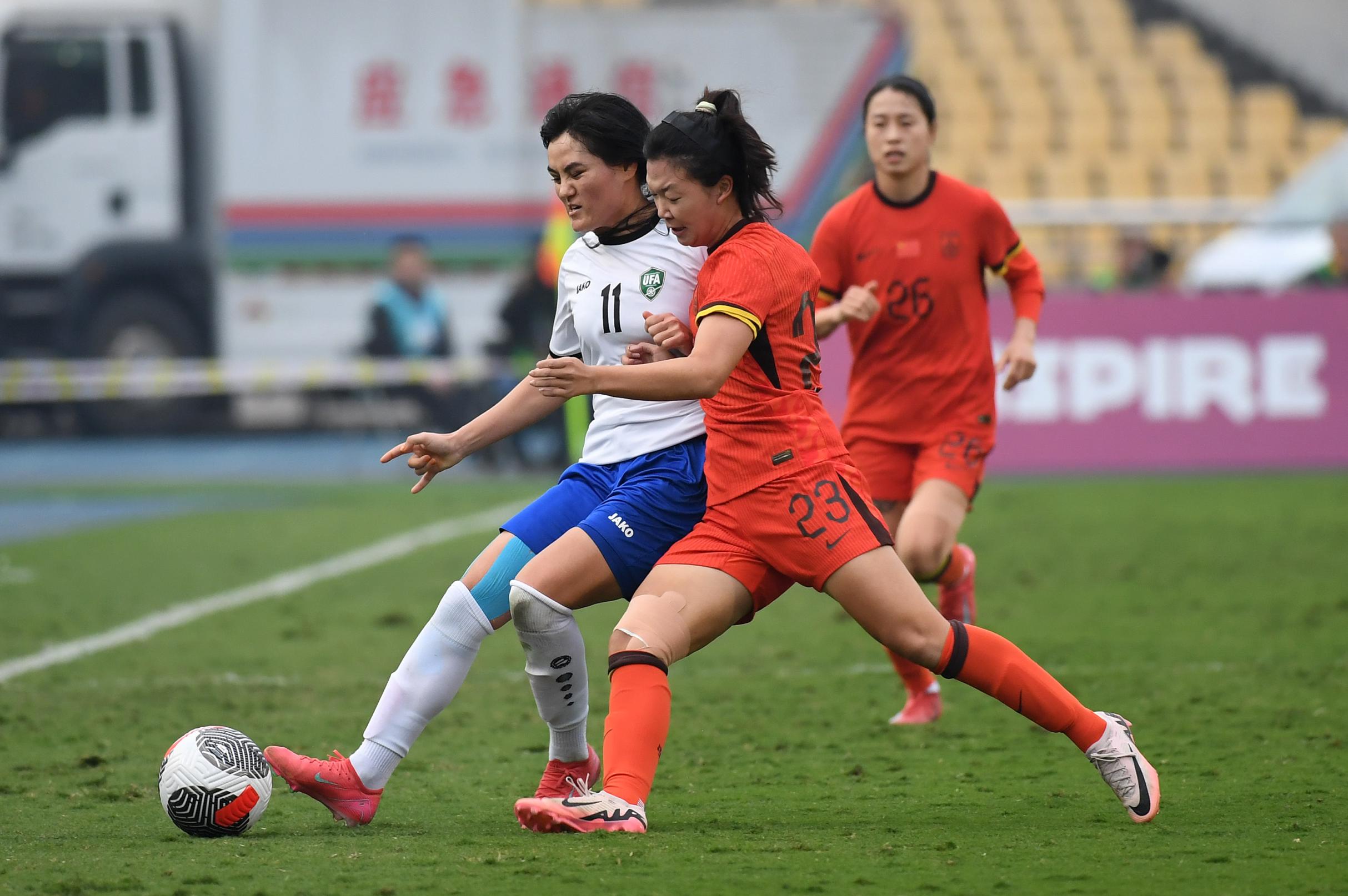 2025年4月,王爱芳(前右)在永川国际女足锦标赛中国队5比0击败乌兹别克斯坦队的比赛中。图片来源:新华社