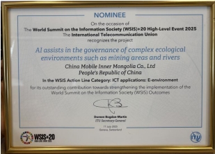 近日,联合国信息社会世界峰会(WSIS)在瑞士日内瓦举行。内蒙古移动“人工智能助力复杂生态环境治理”项目荣获本届竞赛提名奖,也是中国移动参赛的16个项目中唯一获奖的省级公司。