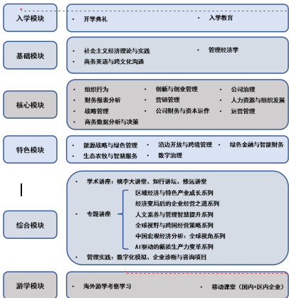 3.时代性——课程体系并非固定模板,而是随时代发展与行业趋势动态迭代,始终紧跟前沿需求。能源战略与绿色管理、生态农牧与智慧服务、沿边开放与跨境管理、数字治理、绿色金融与智能财务等多个课程特色模块,确保课程内容与时代发展同频。