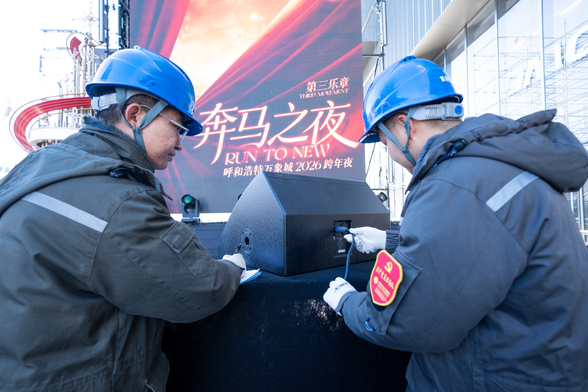 万象城广场灯火璀璨,“奔马之夜”跨年活动即将拉开帷幕。内蒙古电力集团呼和浩特供电公司保电人员早已进驻现场,开展设备巡检,确保这座首府商业地标在跨年夜电力充足、安全无虞。